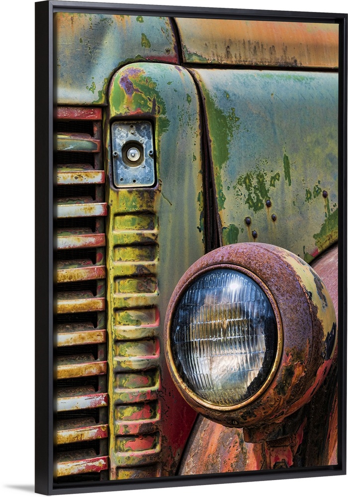<p>A close up photo of weathered old parts of a vintage truck.</p>