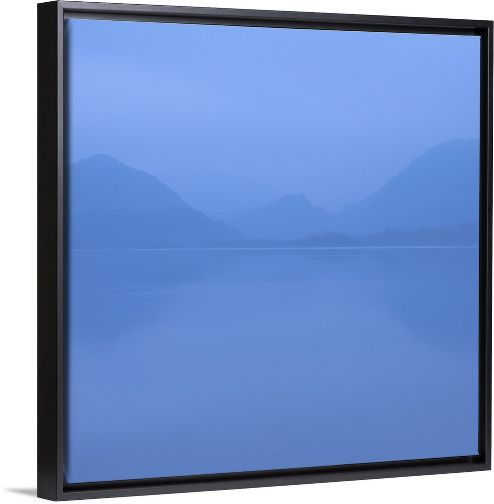 <p>Square photograph of a blue foggy lake with mountains in the background.</p>