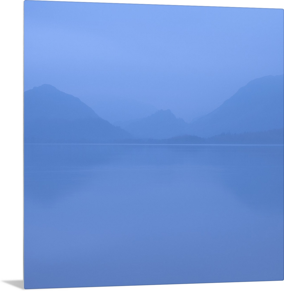 <p>Square photograph of a blue foggy lake with mountains in the background.</p>