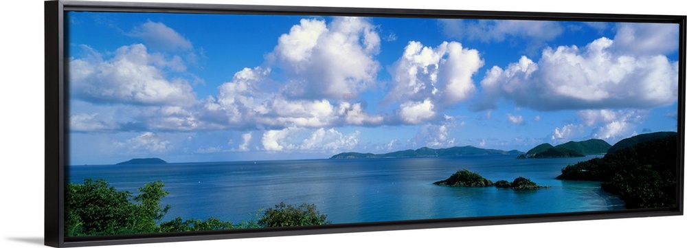 <p>Panoramic photograph of ocean sprinkled with small grass covered islands under a cloudy sky.</p>