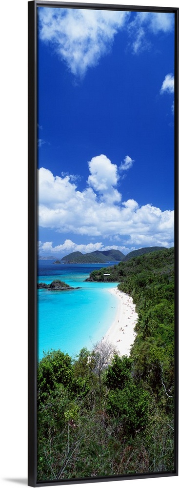 <p>Vertical panoramic picture of the lush tree lined white sand beaches and the turquoise blue waters of Trunk Bay.</p>