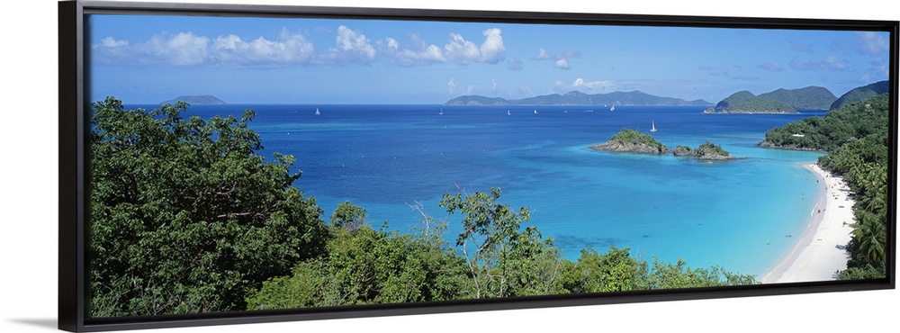 <p>Panoramic photo of a tropical sandy beach, with lush jungle vegetation around the edge, sailboats dotting the ocean.</p>