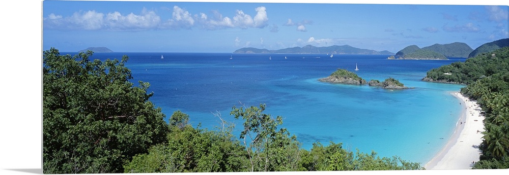 <p>Panoramic photo of a tropical sandy beach, with lush jungle vegetation around the edge, sailboats dotting the ocean.</p>