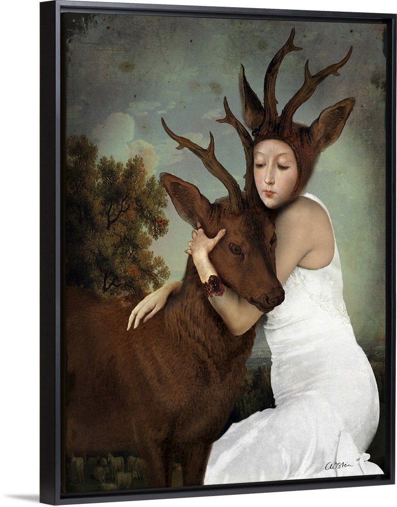 <p>A lady with antlers and ears is hugging a stag.</p>