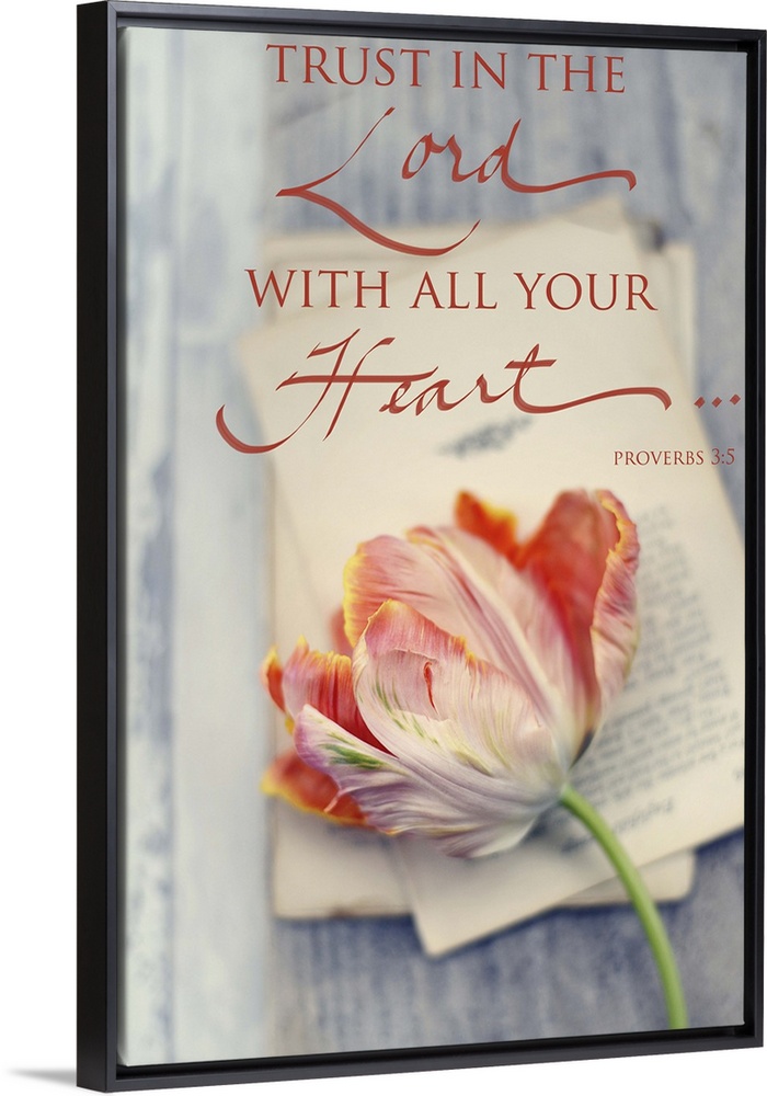 <p>Photograph of a flower laying on top of sheets of typed paper with the bible verse "Trust in the Lord with all your heart..." Proverbs 3:5 written at the top in red.</p>