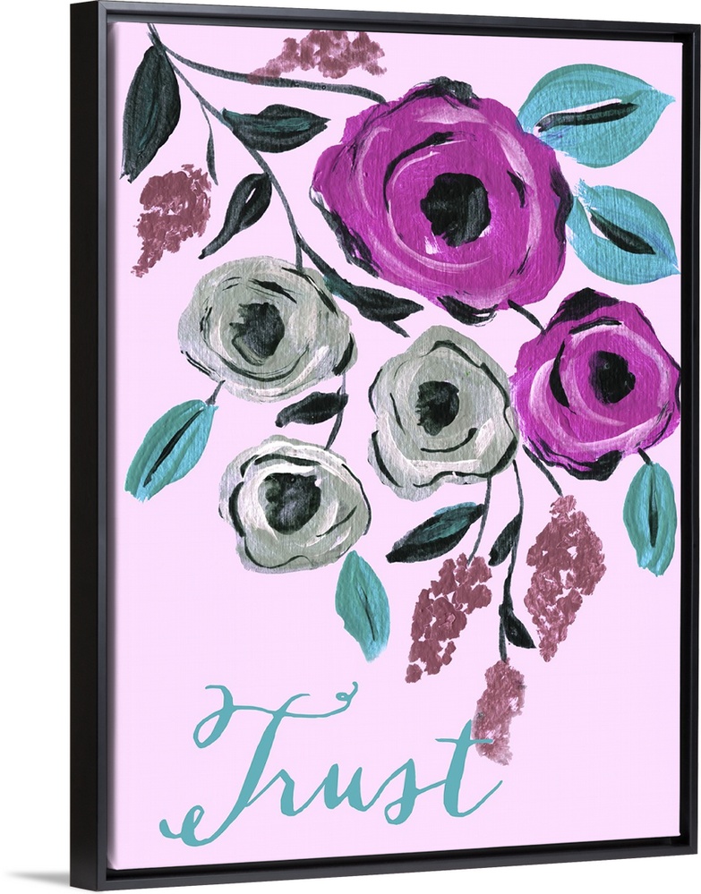 <p>Contemporary painting of purple flowers against a pink background.</p>