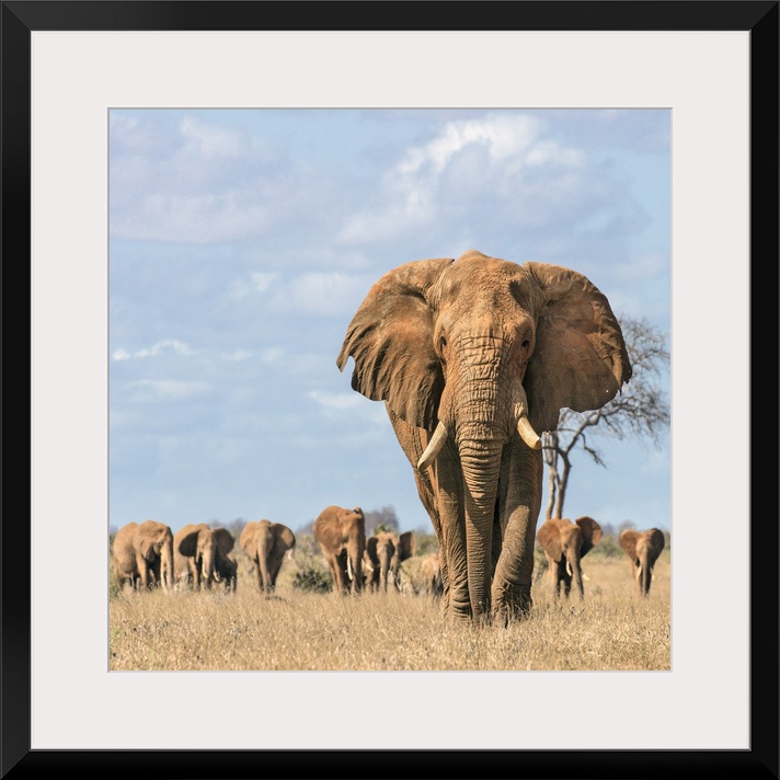 <p>Kenya, Taita-Taveta County, Tsavo East National Park. A fine bull African elephant leads his family herd towards a waterhole.</p>