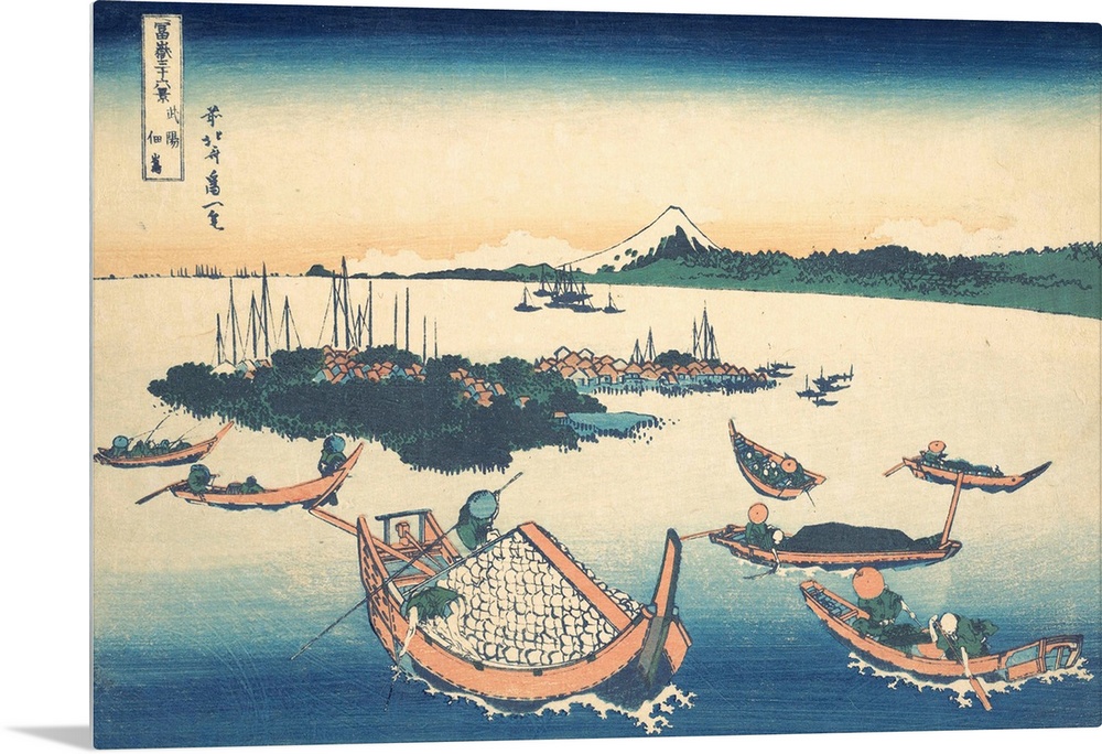 <p>In the foreground a large boat laden with cotton bales moves toward the tiny island of Tsukuda. The boat's shape repeats that of Fuji, creating the rhyming of form so common to Hokusai's style. Other, smaller boats fill the water, giving viewers a sense of the daily life surrounding Tsukuda.</p>