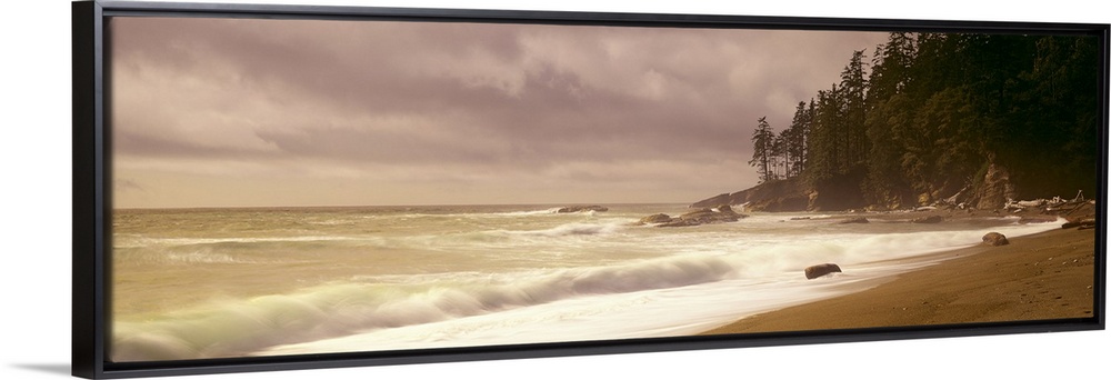 <p>Panoramic picture of waves hitting the shore as the sun peaks through the cloudy sky.</p>