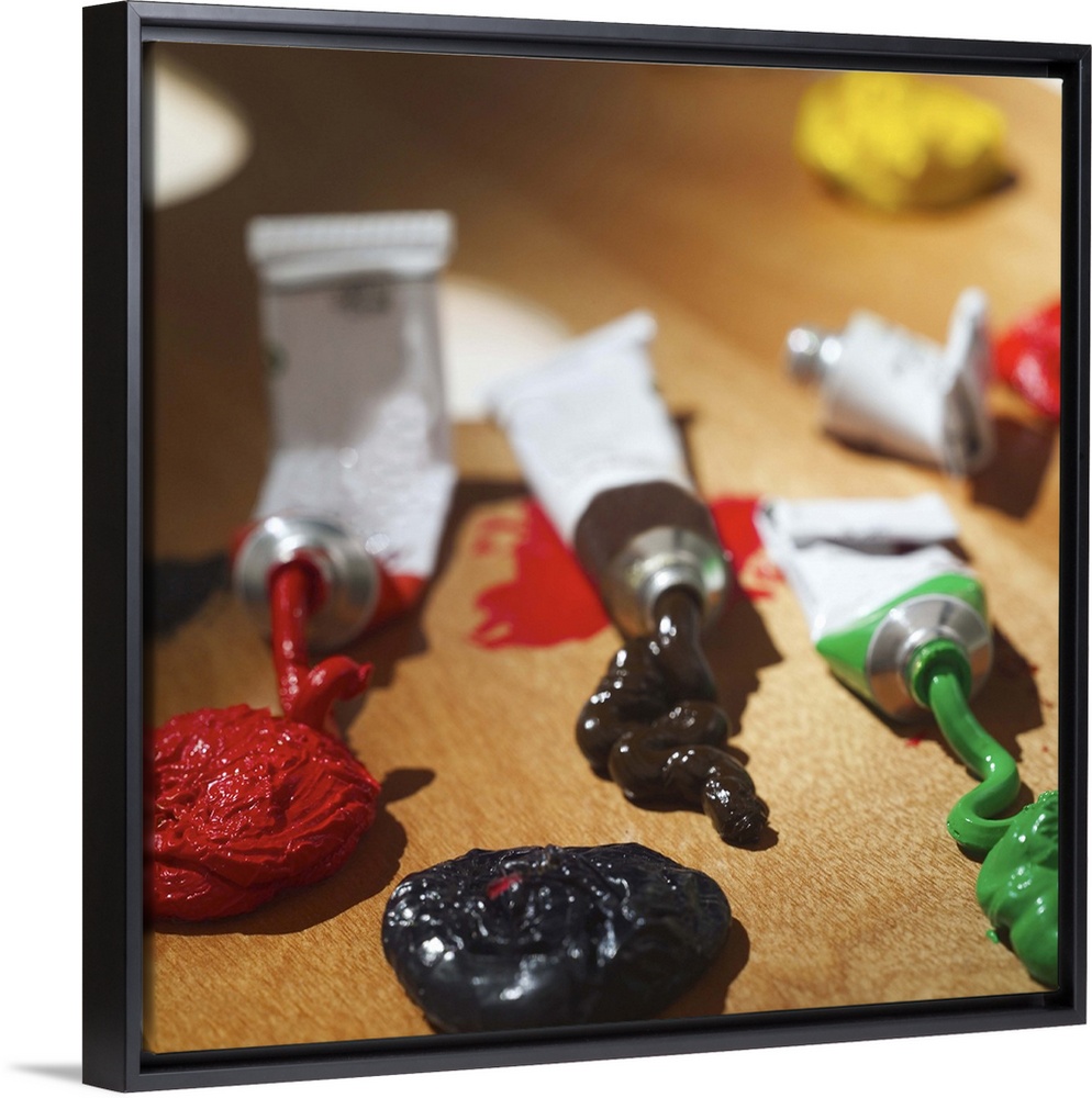 <p>Tubes of paint on a wooden palette</p>