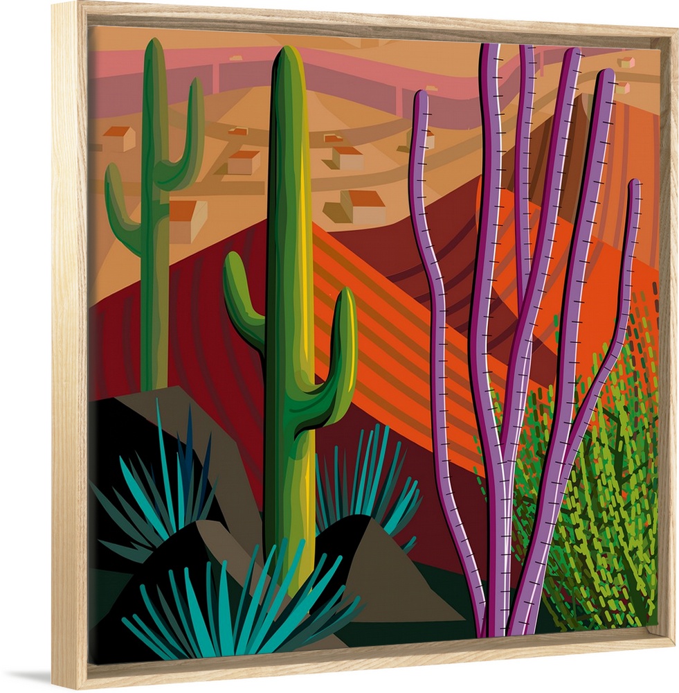<p>Square digital illustration in vibrant colors of Tucson, Arizona.</p>
