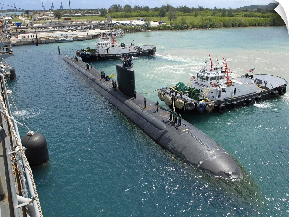 <p>Tugboats assist the Los Angeles-class attack submarine USS Topeka.</p>