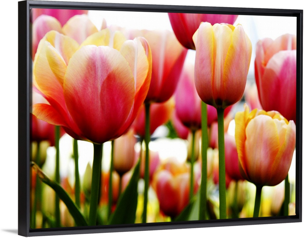 <p>A horizontal photograph of layered rows of colorful tulips.</p>