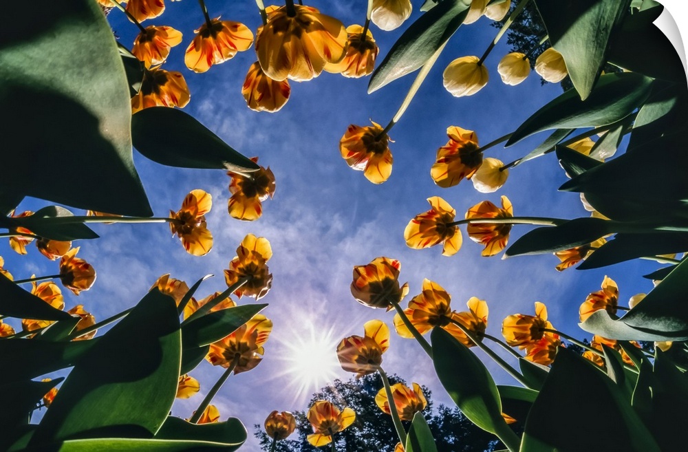 <p>Tulip bed (Tulipa) in bloom against a blue sky with sunburst, New York Botanical Garden; Bronx, New York, United States of America</p>