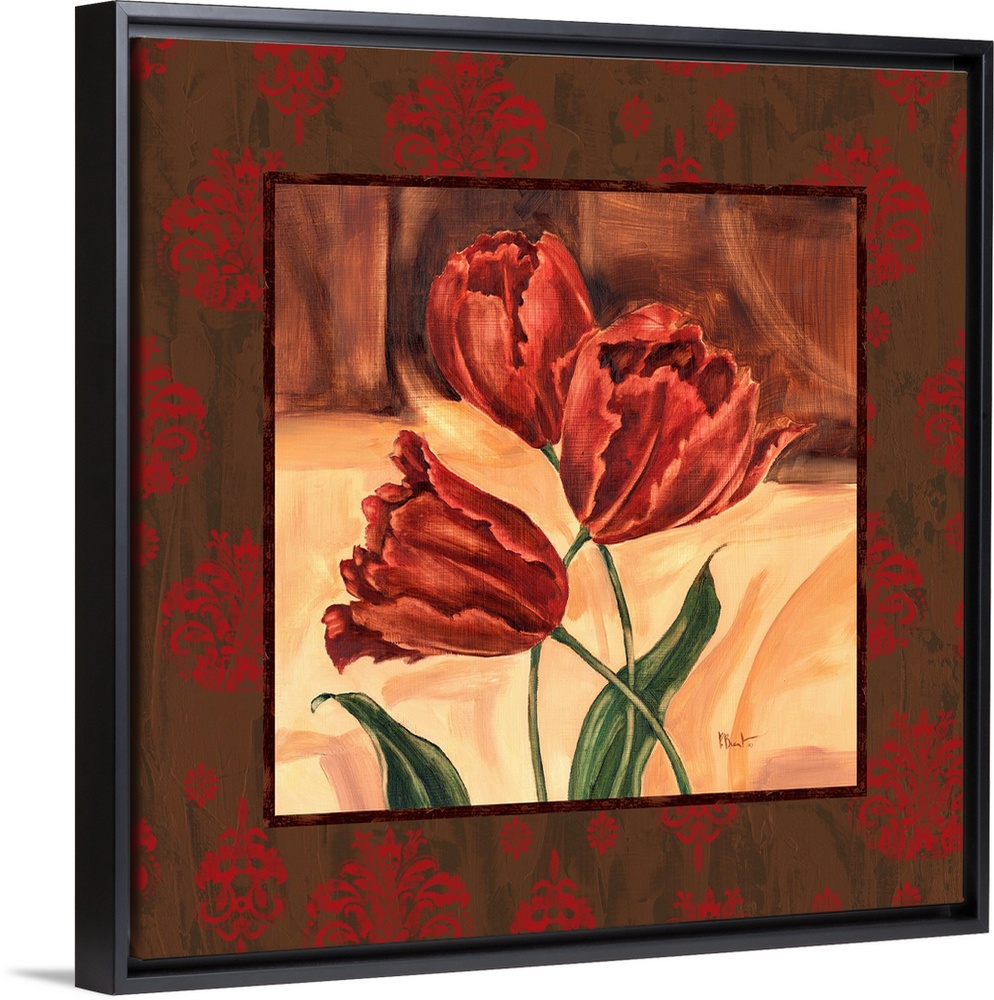 <p>Square painting of three tulips with a border of damask-style flowers.</p>