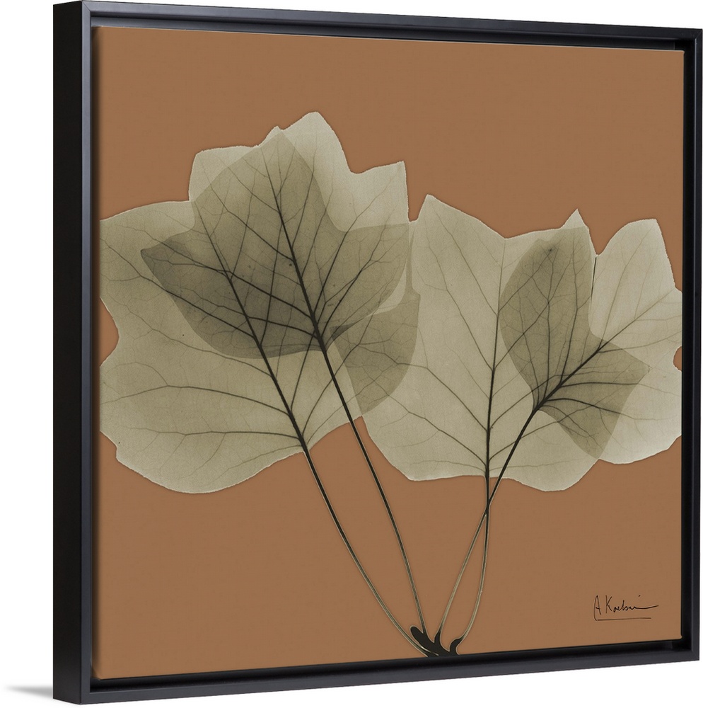 <p>Square x-ray photograph of a group of leaves on the end a tree branch, against an earth toned background.</p>