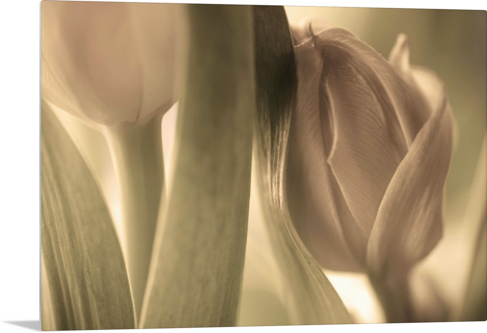 <p>Pastel image of a tulip about to bloom, leaning against another flower.</p>