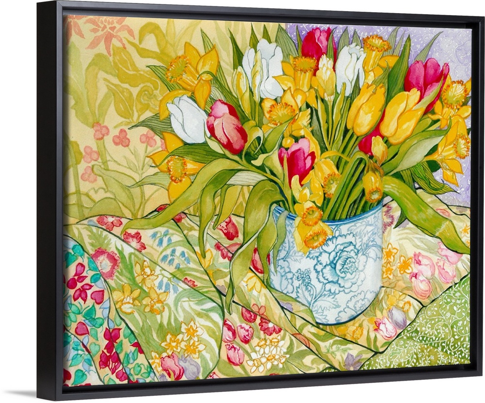<p>Tulips and Daffodils with Patterned Textiles, 2000, originally water colour.</p>