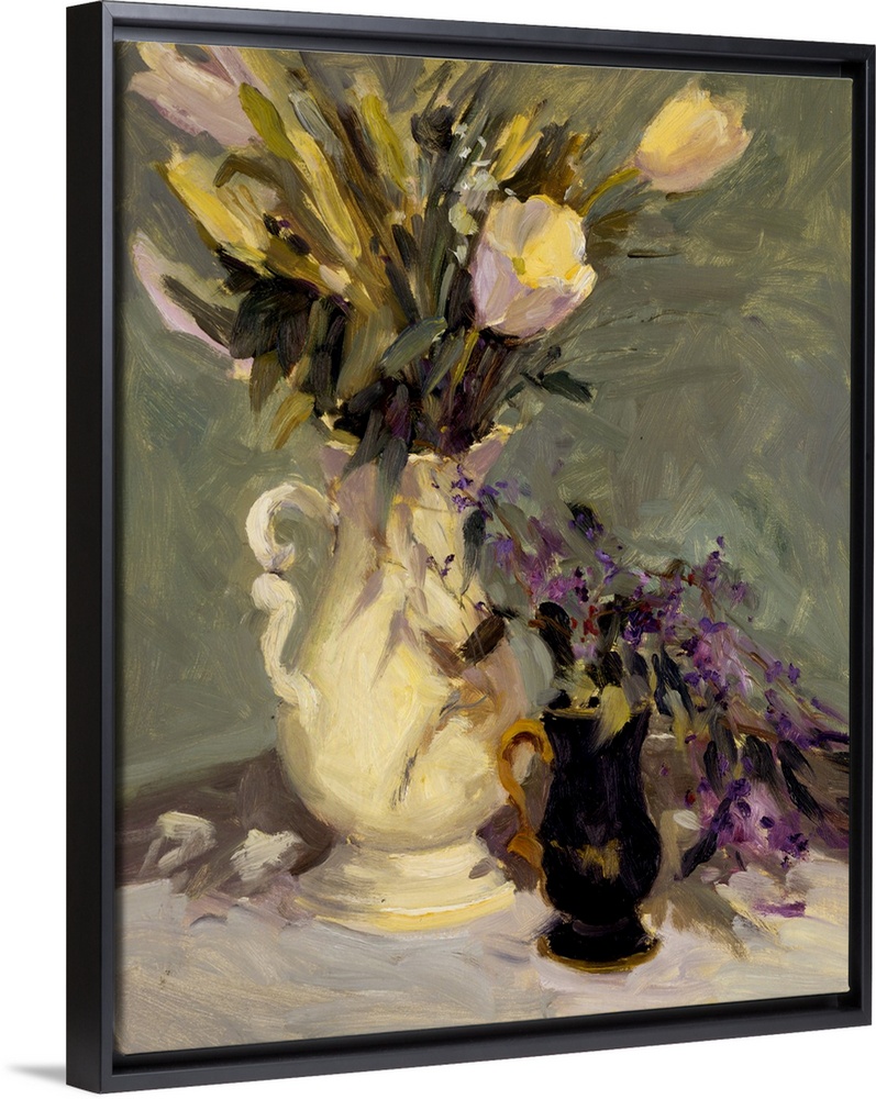 <p>Fine art oil painting still life of tulips and lavender flowers in a white porcelain pitcher on a table with a moss green background, and hints of yellow and black by Allayn Stevens.</p>