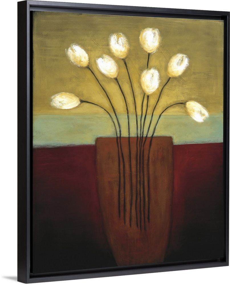 <p>A modern, refined painting of a large vase of white tulips on a burgundy, green and yellow backdrop.</p>