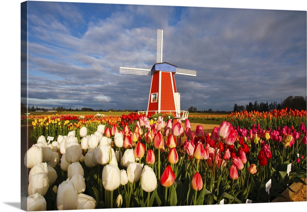 <p>Tulips close-up in the foreground and a windmill on Wooden Shoe Tulip Farm, Woodburn, Oregon, United States of America</p>