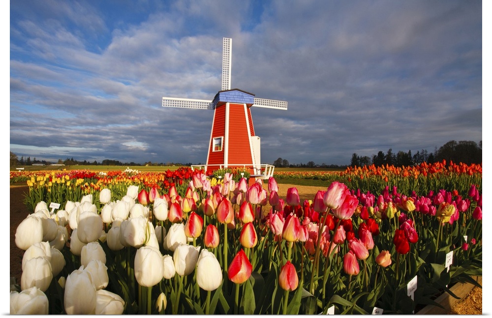 <p>Tulips close-up in the foreground and a windmill on Wooden Shoe Tulip Farm, Woodburn, Oregon, United States of America</p>