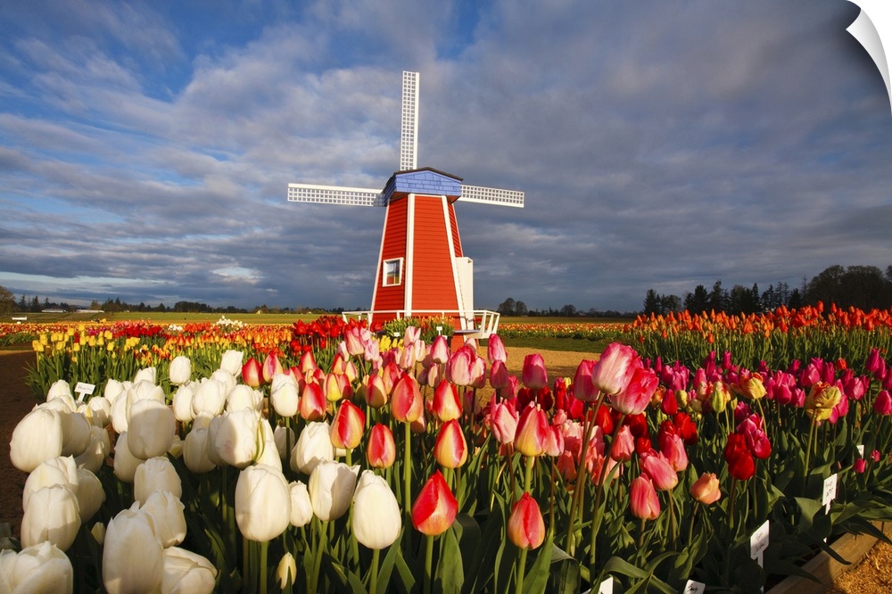 <p>Tulips close-up in the foreground and a windmill on Wooden Shoe Tulip Farm, Woodburn, Oregon, United States of America</p>