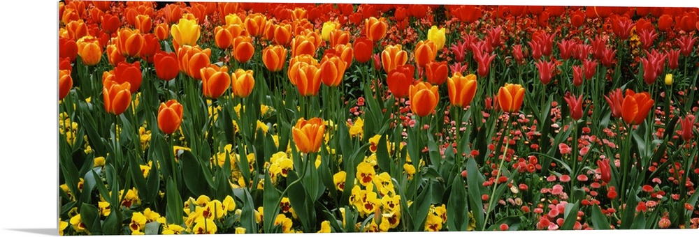 <p>A flower bed of spring flowers captured in a panoramic shaped photograph on decorative wall art for the home or office.</p>