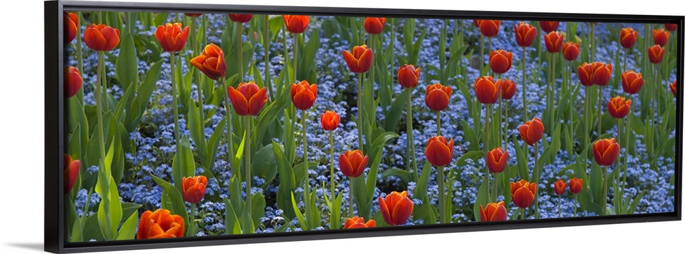 <p>Panoramic picture taken of a field of flowers. Small blue flowers grow underneath the tall tulips.</p>