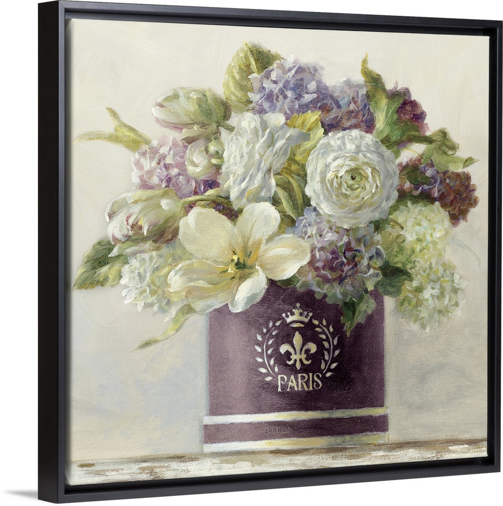 <p>Still life painting of a hatbox filled with a variety of flowers against a soft background.</p>