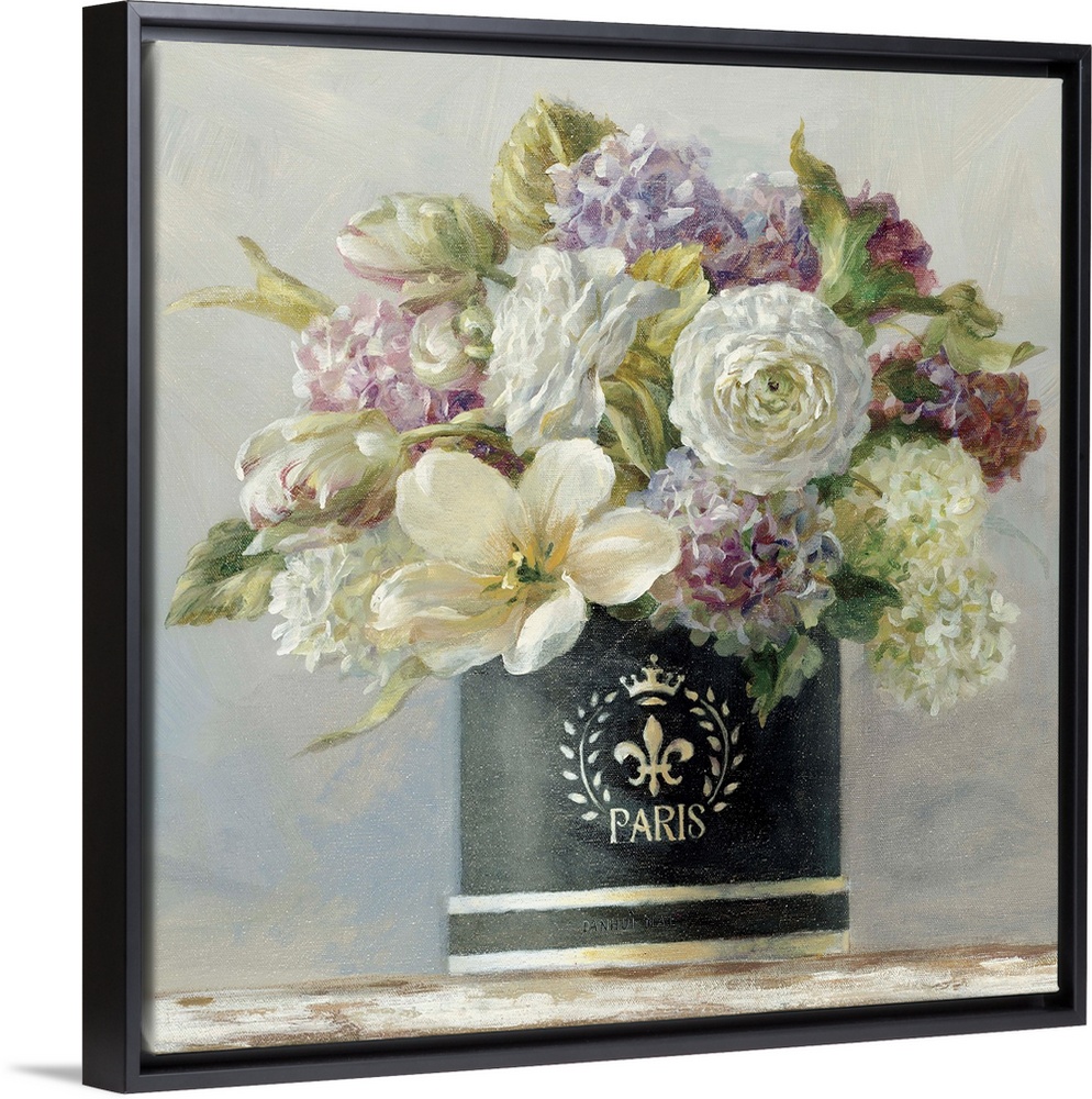 <p>Contemporary painting of a bouquet of flowers in a planter, sitting on a table.</p>