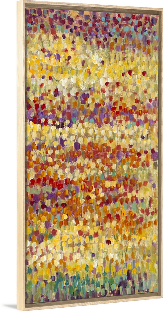 <p>Vertical contemporary painting of a field of tulips in bright, colorful dots of colors in an impressionism style.</p>