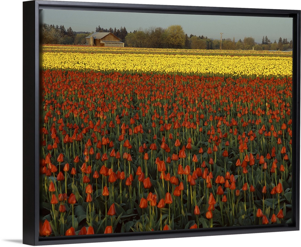 <p>Landscape photograph of a field filled with red and yellow tulips with a barn in the background.</p>