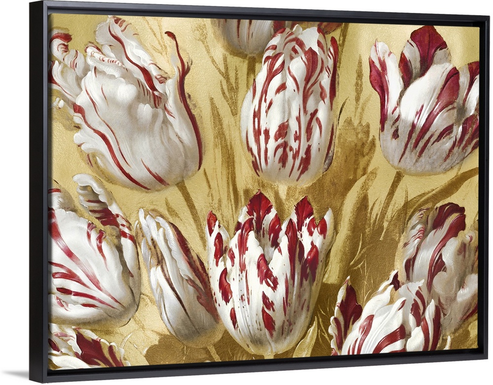 <p>This romantic artwork features a tulip bouquet of white flowers with red accents against a gold background.</p>