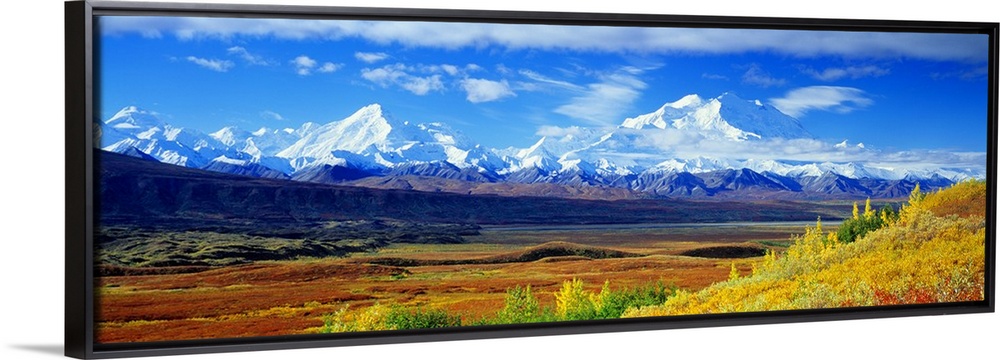 <p>A large panoramic photograph of Mount McKinley taken from afar with terrain and grasslands in the foreground.</p>