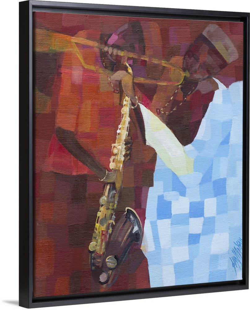 <p>Dressed in traditional costumes, Hausa men from northern Ghana bring the joy of music to their audience. Everybody has a story to tell, like a tune in a song, believes John Atta Mensah. Painting with acrylics in his unique style, the Ghanaian artist portrays the musicians playing a sax and trumpet.</p>