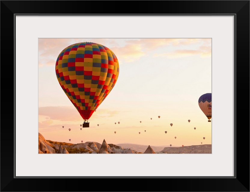 <p>Turkey, Central Anatolia, Cappadocia, Hot air balloons at sunset.</p>