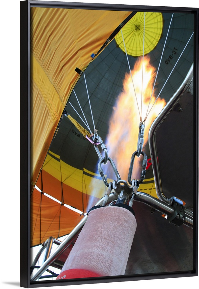<p>Turkey,Anatolia,Cappadocia, Goreme. Inside of hot air balloon flying above/among rock formations and field landscapes in the Red Valley, Goreme National Park, UNESCO World Heritage Site. Visual flame heating up Balloon.</p>
