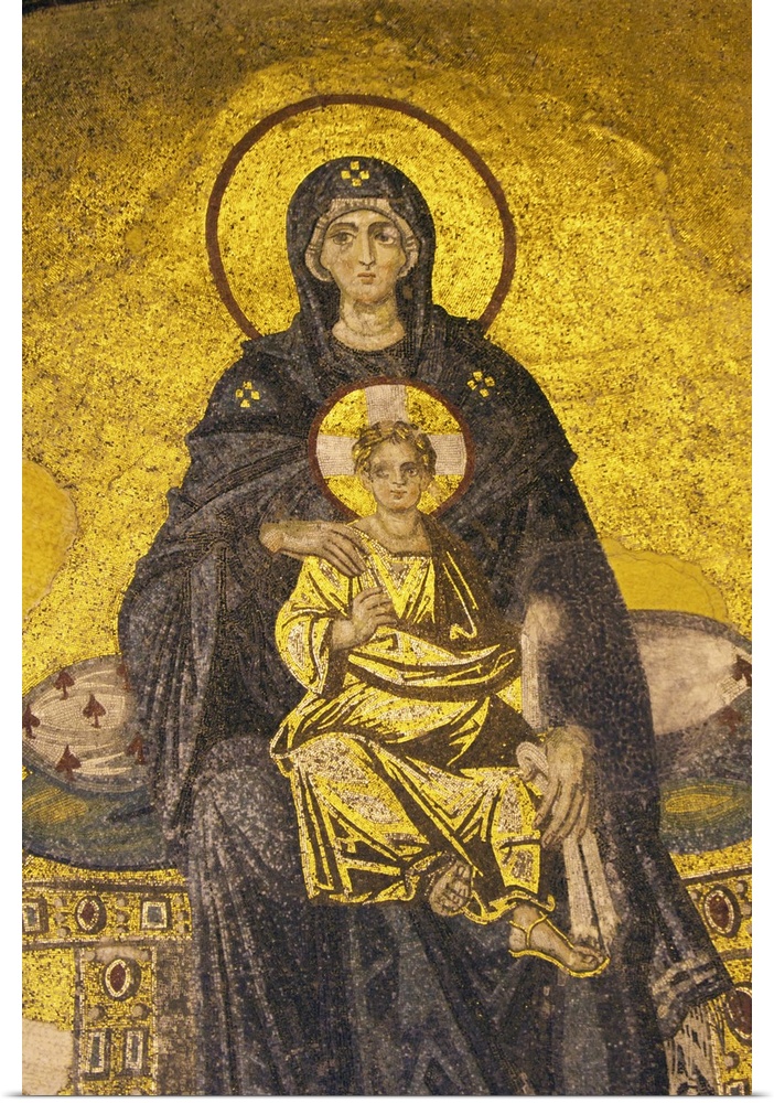 <p>Turkey, Hagia Sophia Mosque, Close up of mosaic depicting Virgin Mary with baby Jesus</p>