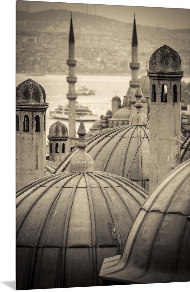 <p>Turkey, Istanbul, Sultanahmet, domes of the Suleymaniye Mosque (Suleymaniye Camii) complex with New Mosque (Yeni Camii) beyond</p>