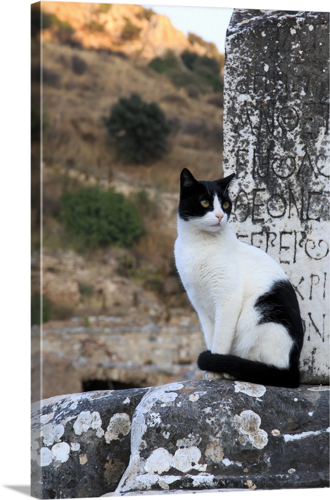 <p>Turkey, Izmir Province, Selcuk, ancient city Ephesus, ancient world center of travel and commerce on the Aegean Sea at mouth of Cayster River. Catsitting near column of temple,</p>