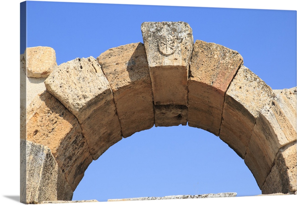 <p>Turkey, southwestern Turkey, Denizli Province, River Menderes valley, Pamukkale, ruins of Hierapolis, founded in 190 B.C. by Eumenes II, king of Pergamon. Developed as a Roman thermal bath center. Keystone of archway.</p>