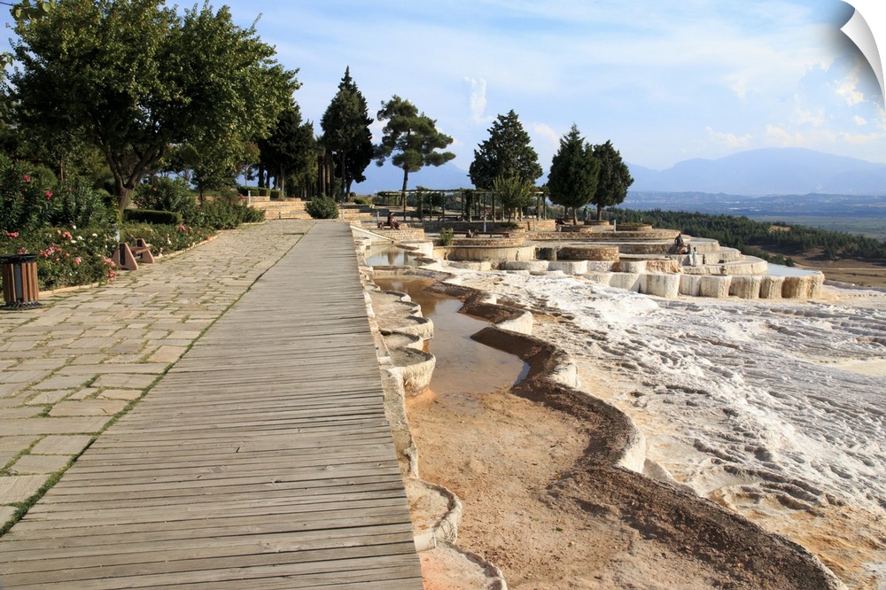 <p>Turkey, southwestern Turkey, Denizli Province, River Menderes valley, Pamukkale, (""cotton castle"") a natural site of hot springs and travertines, terraces of carbonate minerals. Boardwalk above mineral pools.</p>