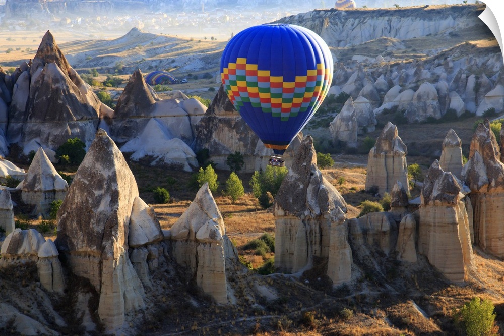 <p>Turkey,Anatolia,Cappadocia, Goreme. Hot air balloon flying above/among rock formations and field landscapes in the Red Valley, Goreme National Park, UNESCO World Heritage Site.</p>