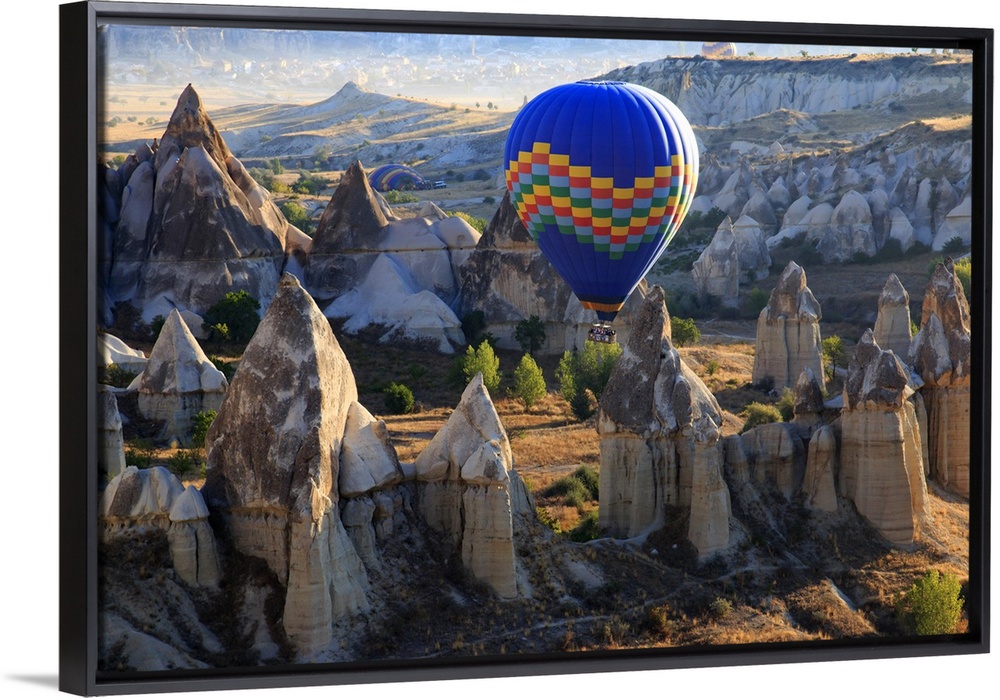 <p>Turkey,Anatolia,Cappadocia, Goreme. Hot air balloon flying above/among rock formations and field landscapes in the Red Valley, Goreme National Park, UNESCO World Heritage Site.</p>