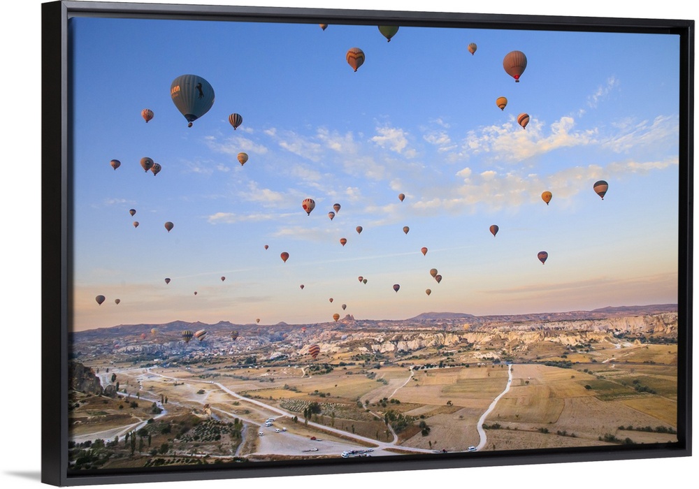 <p>Turkey,Anatolia,Cappadocia, Goreme. Hot air balloons flying above/among rock formations and field landscapes in the Red Valley, Goreme National Park, UNESCO World Heritage Site.</p>