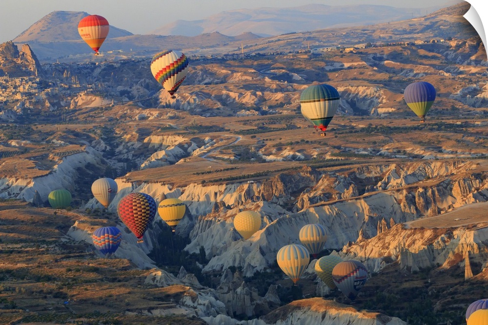 <p>Turkey,Anatolia,Cappadocia, Goreme. Hot air balloons flying above/among rock formations and field landscapes in the Red Valley, Goreme National Park, UNESCO World Heritage Site.</p>