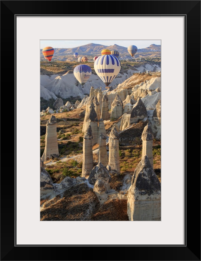 <p>Turkey,Anatolia,Cappadocia, Goreme. Hot air balloons flying above/among rock formations, ""Fairy Chimneys"" and field landscapes in the Red Valley, Goreme National Park, UNESCO World Heritage Site.</p>