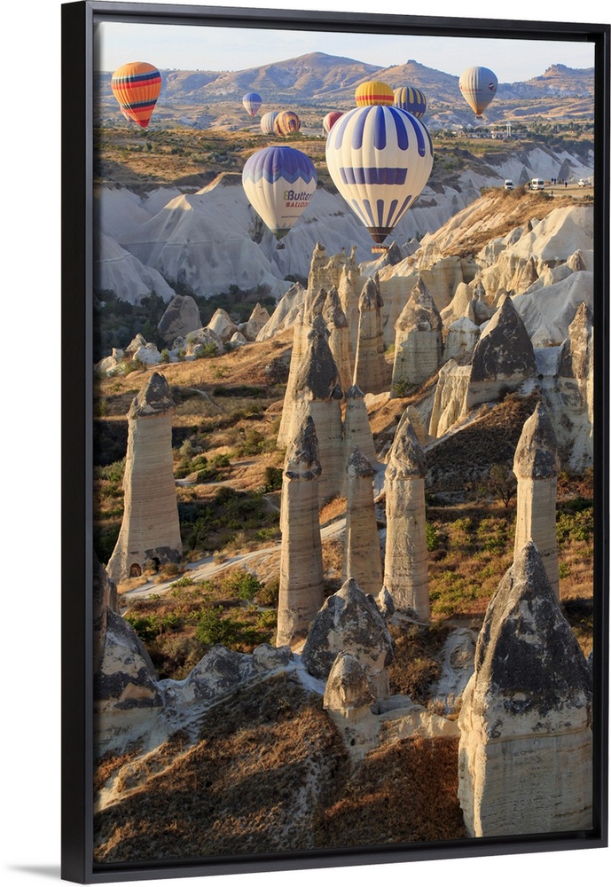 <p>Turkey,Anatolia,Cappadocia, Goreme. Hot air balloons flying above/among rock formations, ""Fairy Chimneys"" and field landscapes in the Red Valley, Goreme National Park, UNESCO World Heritage Site.</p>