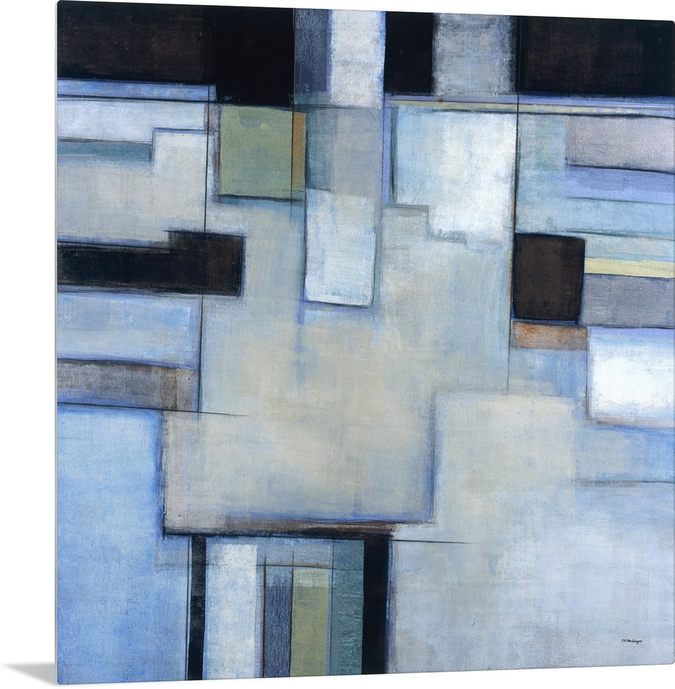 <p>A square abstract painting with square shapes in shades of blue.</p>